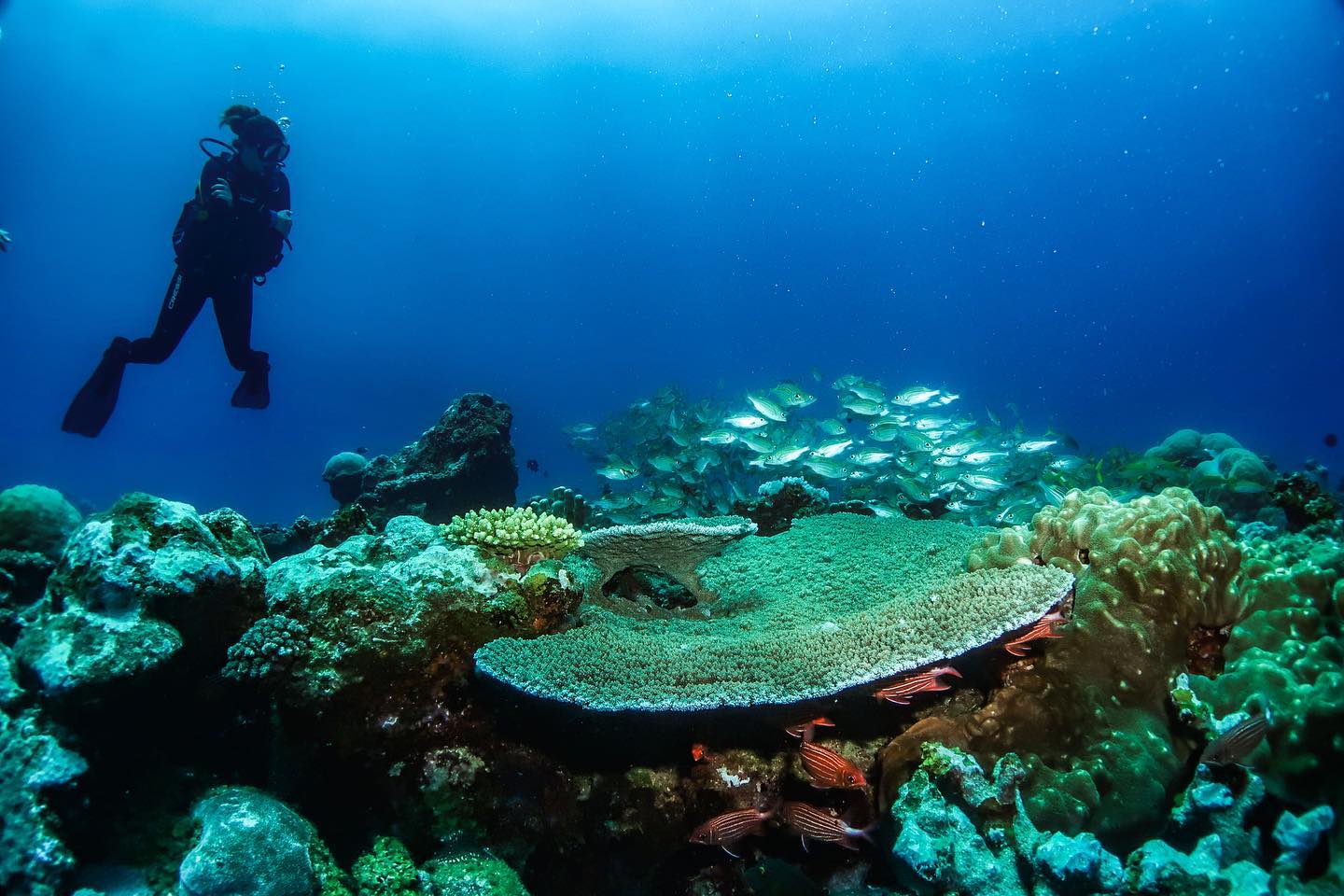 Pereybere’s calm lagoon provides an ideal environment for training dives, while outer sites like Coin de Mire and deeper reefs offer variety for experienced divers.